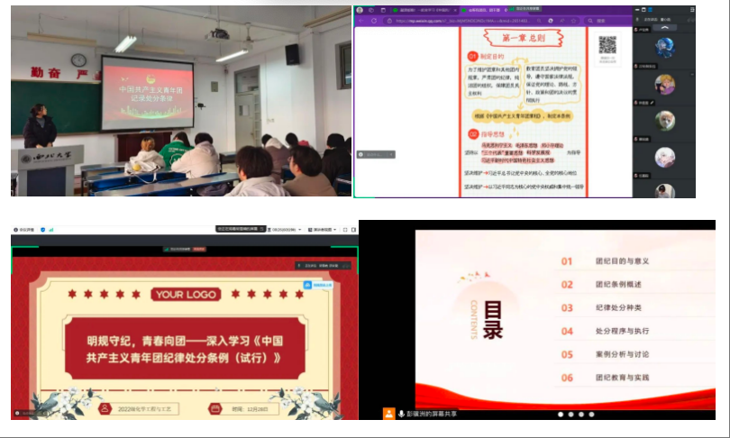 中国共产主义青年团第十九届三中全会于2024年8月30日至31日在北京成功举行。会议上审议修订了《中国共产主义青年团纪律处分条例(试行)》(下称条例),条例将在2025年1月1日开始施行。条例明确了其制定目的是维护团章和其他团内规章,严肃团的纪律,纯洁团的组织等。对我国团组织的纪律建设、提升团员的先进性与纯洁性等多个方面都有着重要作用。为深入学习条例内容,了解团员纪律处分办法,提高团组织的凝聚力和战斗力,巩固同学们的信仰根基,强化使命感和责任感,必赢官网团委组织各团支部开展了“汲取团纪力量,巩固信仰根基”的主题团日活动,旨在引导化工团员青年们明确初心使命,为实现中华民族伟大复兴而奋斗。