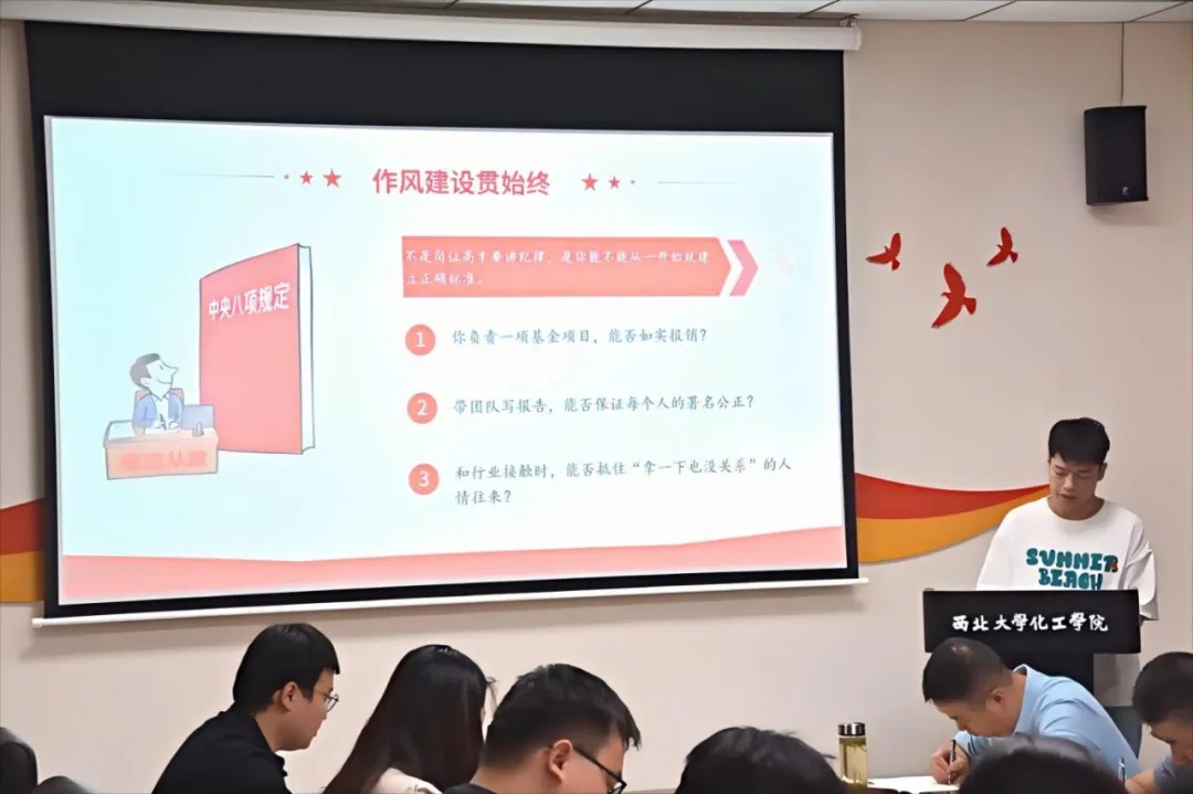 学院党委书记寇楠以廉洁教育为主题,为毕业生党员讲授了一堂内容丰富、内涵深刻的专题党课。她给毕业生党员提出了三点期望和要求:一是回望初心,在淬炼中筑牢党员底色,无论将来身处何处,都要以“永远在路上”的清醒对照党员标准校准人生航向;二是严守底线,在自律中践行廉洁初心,以慎始、慎微、慎独的态度筑牢廉洁防线,将廉洁刻在骨子里;三是奔赴山海,在担当中书写时代答卷,勇于做“信念如磐”的追梦者、“知行合一”的实干者、“胸怀天下”的奉献者。让“公诚勤朴”的校训和“团结·拼搏·求实·创新”的化工精神融入血液,与“为人民谋幸福”的初心同频共振。